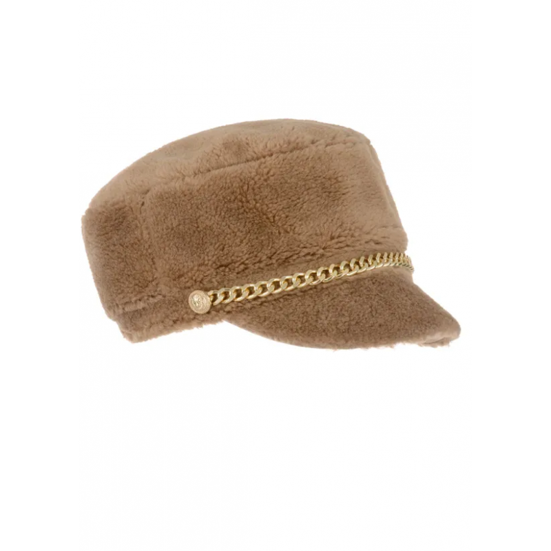 Modna czapka z daszkiem w kolorze karmelowym. Wykonana z wełny. Model zdobiony efektownym łańcuszkiem. Czapka będzie doskonałym dodatkiem do zimowych stylizacji.