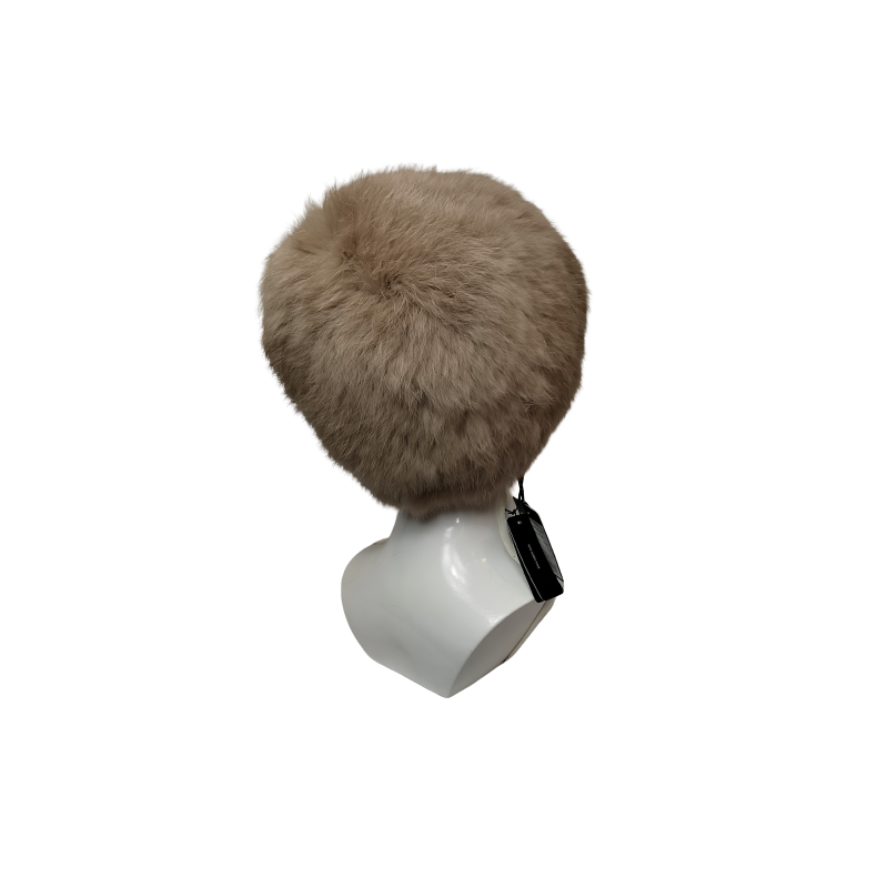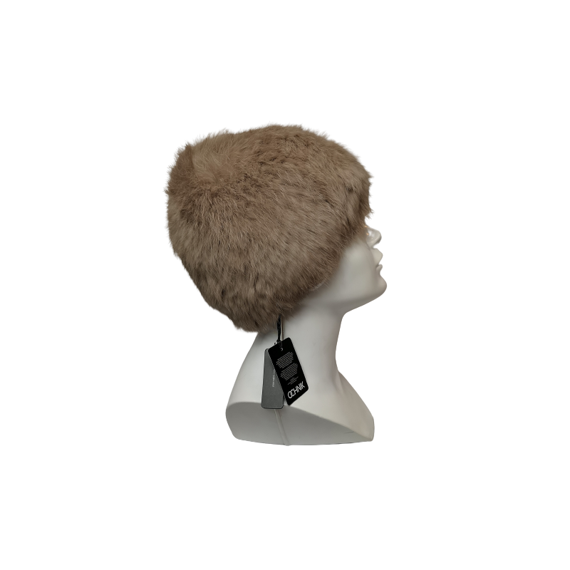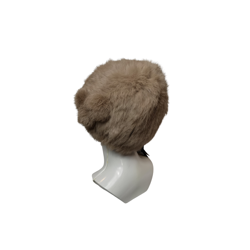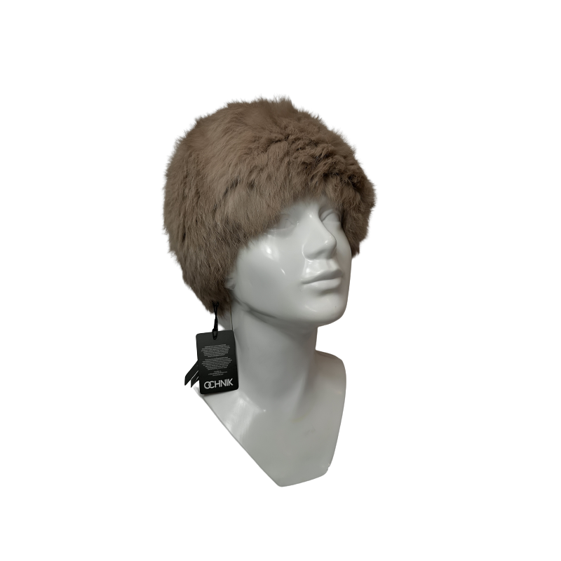 Ciepła finezyjna czapka damska z naturalnego futra z królika w kolorze ciemnego beżu. Z przodu zdobienie z 3 kulek w tym samym kolorze.