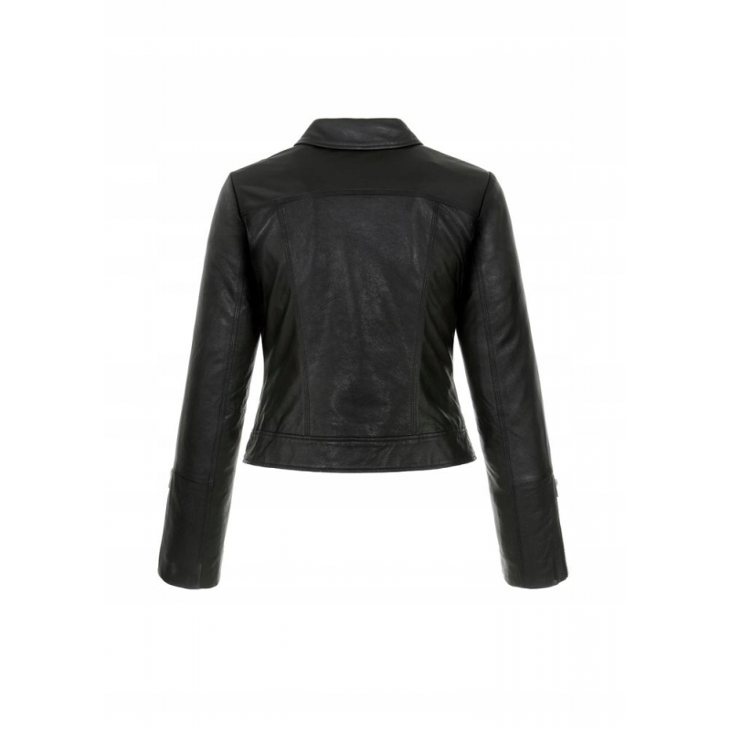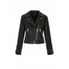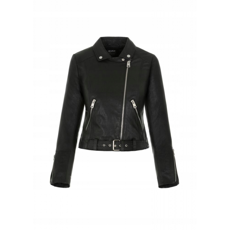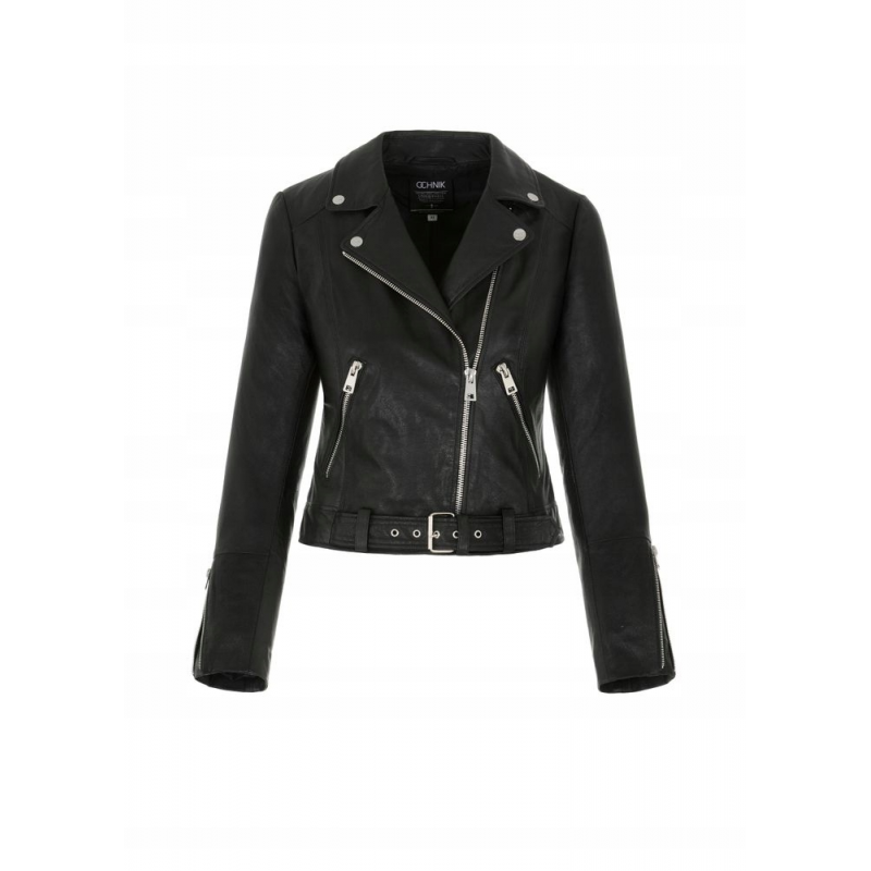 Krótka kurtka damska typu ramoneski. Uszyta z miękkiej owczej skóry typu New Zeland w czarnym kolorze. Zapinana na asymetryczny suwak – charakterystyczne zapięcie poszerza optycznie górną partię sylwetki. Elementy wykończenia utrzymane w rockowym stylu. Model nieocieplany, kołnierz z klapami, asymetryczny suwak, dwie kieszenie na suwak, suwaki w mankietach dla lepszej swobody, pasek bez możliwości odpięcia, elementy metalowe w kolorze jasnego niklu, długość zakrywająca talię