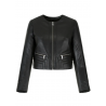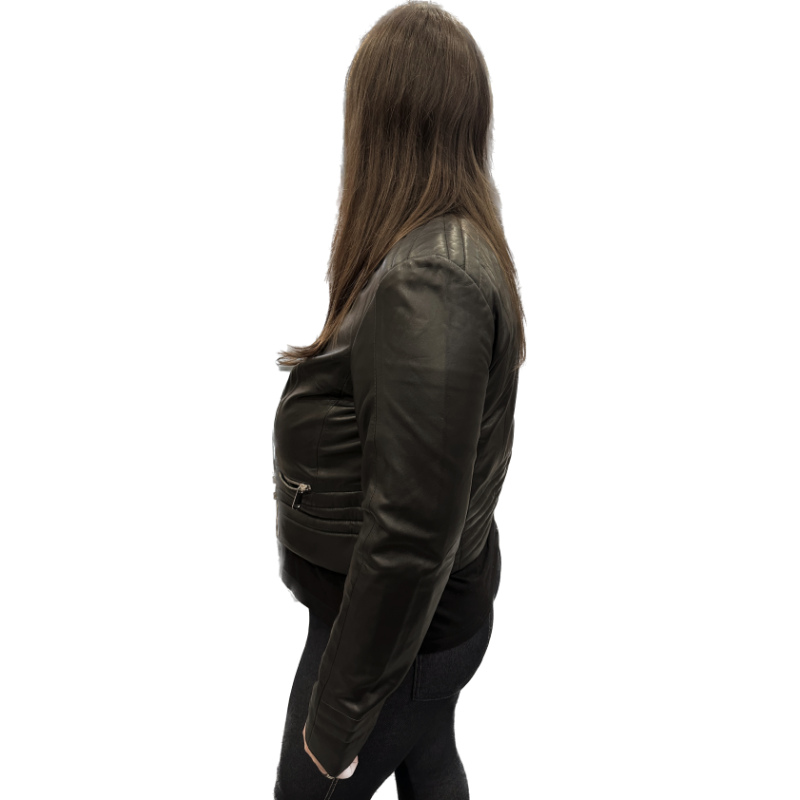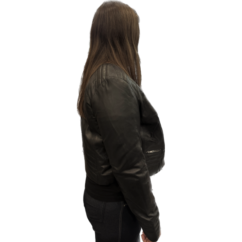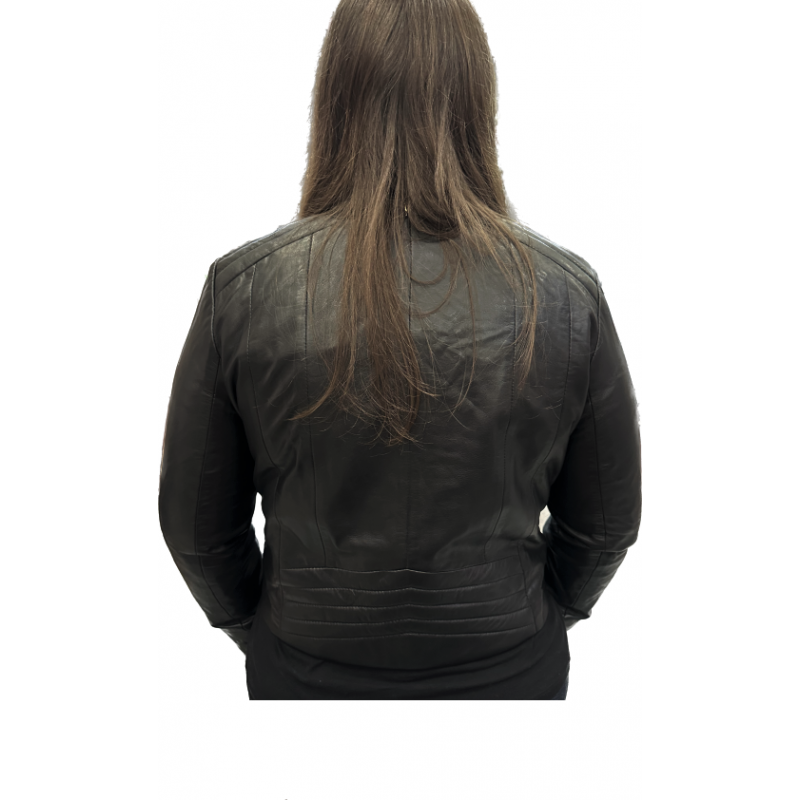 Kurtka damska w kolorze czarnym. Wykonana z miękkiej, naturalnej skóry owczej. Krótka forma, liczne przeszycia oraz naturalne w chwycie wykończenie skóry w klasycznym kolorze nadają modelowi codziennego, niezobowiązującego, casualowego charakteru. Model nieocieplany, dekolt okrągły, zapinana na suwak, dwie wpuszczane kieszenie zamykane na suwak, długość sięgająca talii, elementy metalowe w kolorze jasnego niklu.