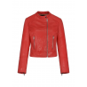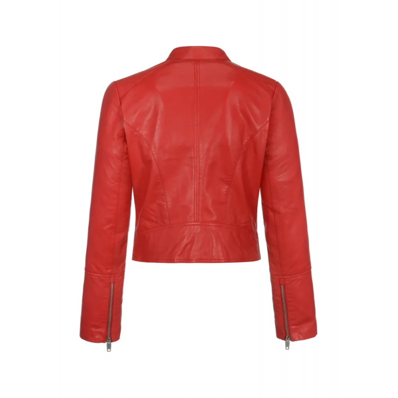 Kurtka damska uszyta z naturalnej skóry owczej w czerwonym kolorze. Model ze stójką. Uniwersalna forma gwarantuje ponadczasowość modelu. Forma dopasowana, zapięcie na suwak, dwie kieszenie zapinane na suwak, suwaki w mankietach dla lepszej swobody, długość sięgająca bioder, elementy metalowe w kolorze srebrnym