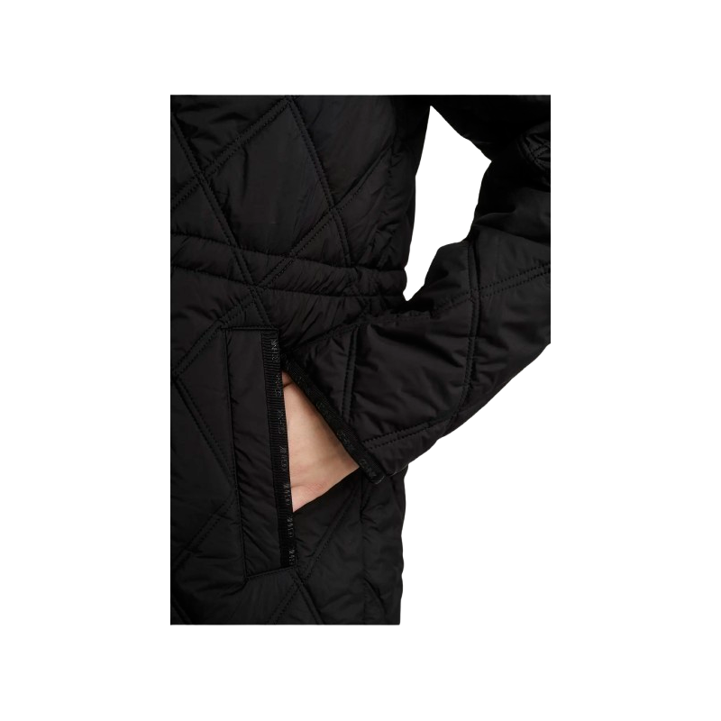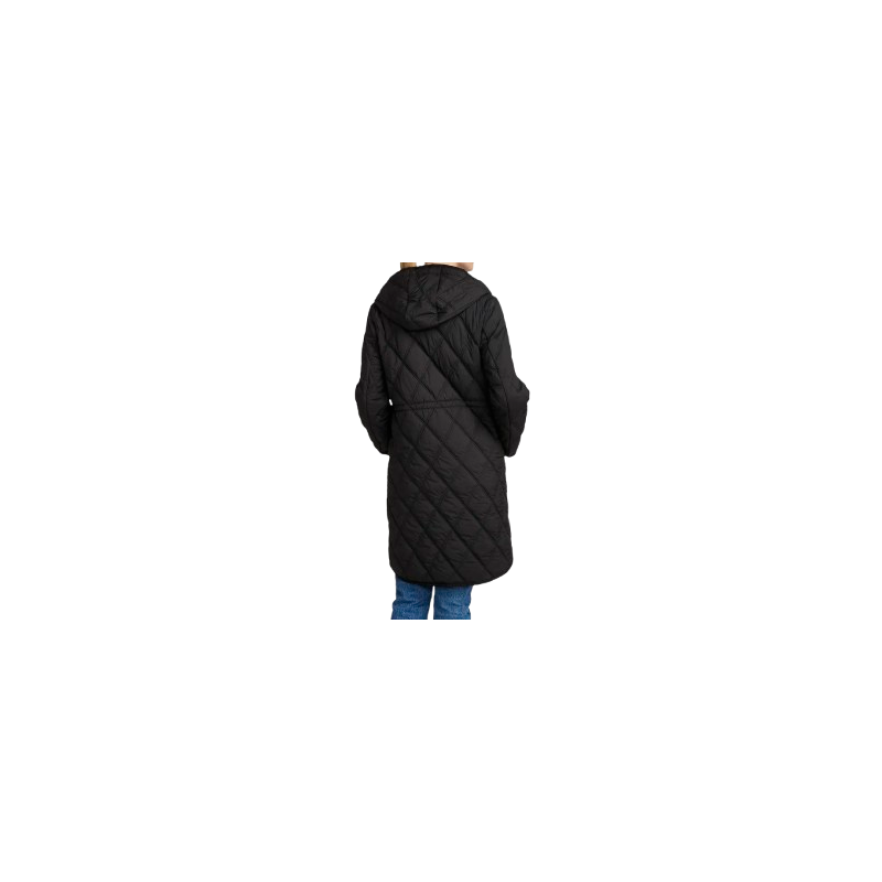 Kurtka damska wykonana z wytrzymałej tkaniny poliestrowej, z lekkim ociepleniem, zapewnia komfort i ochronę przed zimnem. Model o długości za kolano wyróżnia się ozdobnym pikowaniem i praktycznymi detalami, takimi jak wewnętrzny ściągacz w talii, który podkreśla sylwetkę, oraz kaptur z wiązaniem dla lepszej ochrony przed wiatrem. Lamówki z logotypem dodają oryginalnego charakteru, a wpuszczane kieszenie zwiększają funkcjonalność. Zapięcie na napy ułatwia użytkowanie. To idealna kurtka na sezon przejściowy i zimowy dla kobiet ceniących wygodę i styl.