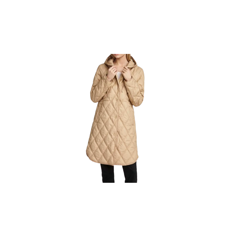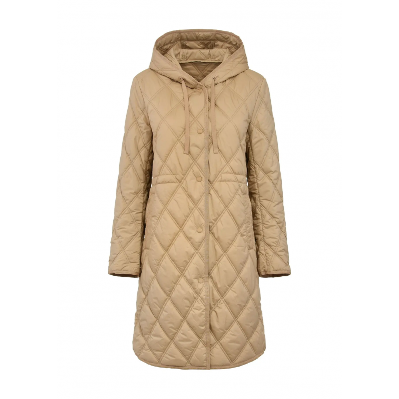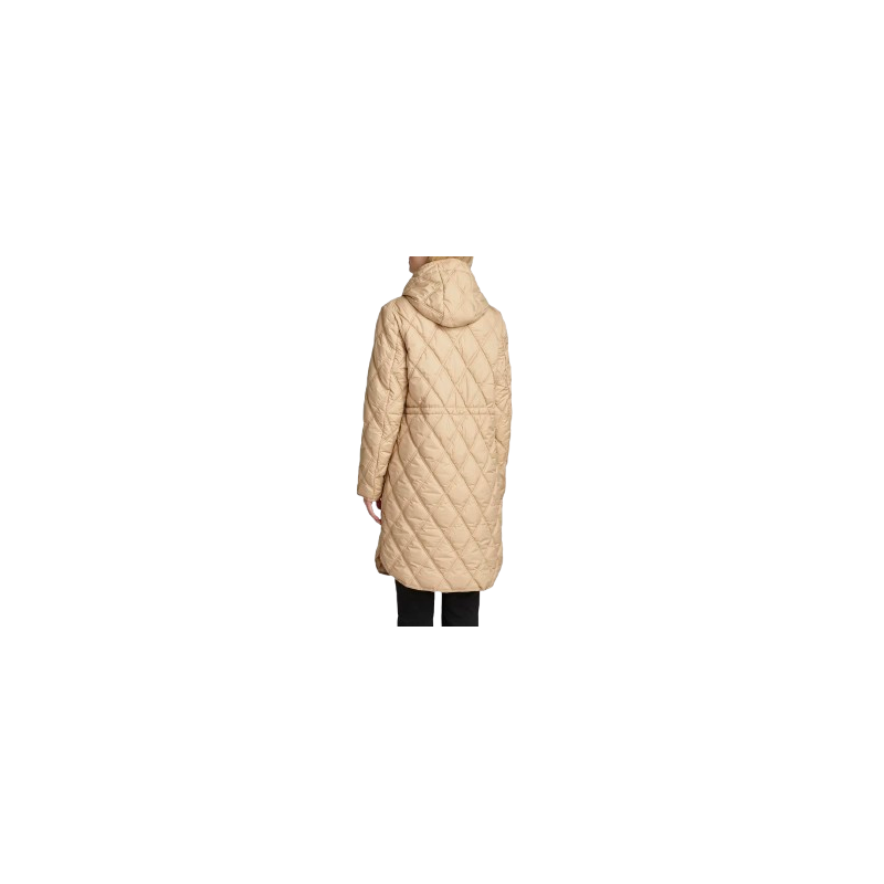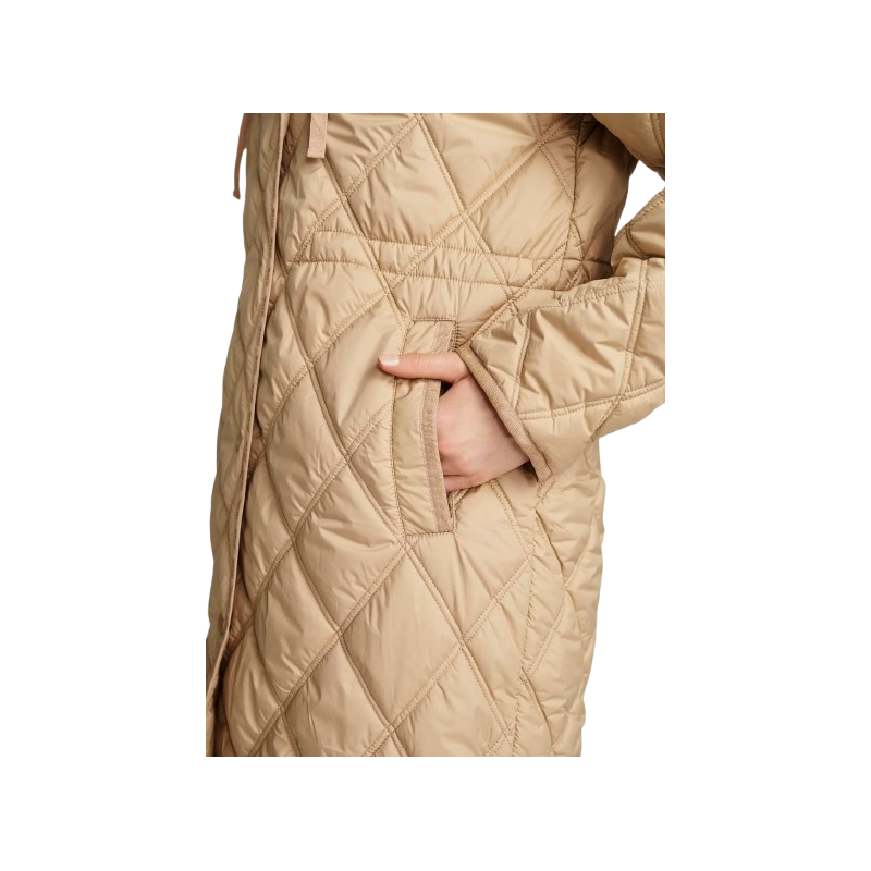 Kurtka damska wykonana z wytrzymałej tkaniny poliestrowej, z lekkim ociepleniem, zapewnia komfort i ochronę przed zimnem. Model o długości za kolano wyróżnia się ozdobnym pikowaniem i praktycznymi detalami, takimi jak wewnętrzny ściągacz w talii, który podkreśla sylwetkę, oraz kaptur z wiązaniem dla lepszej ochrony przed wiatrem. Lamówki z logotypem dodają oryginalnego charakteru, a wpuszczane kieszenie zwiększają funkcjonalność. Zapięcie na napy ułatwia użytkowanie. To idealna kurtka na sezon przejściowy i zimowy dla kobiet ceniących wygodę i styl.