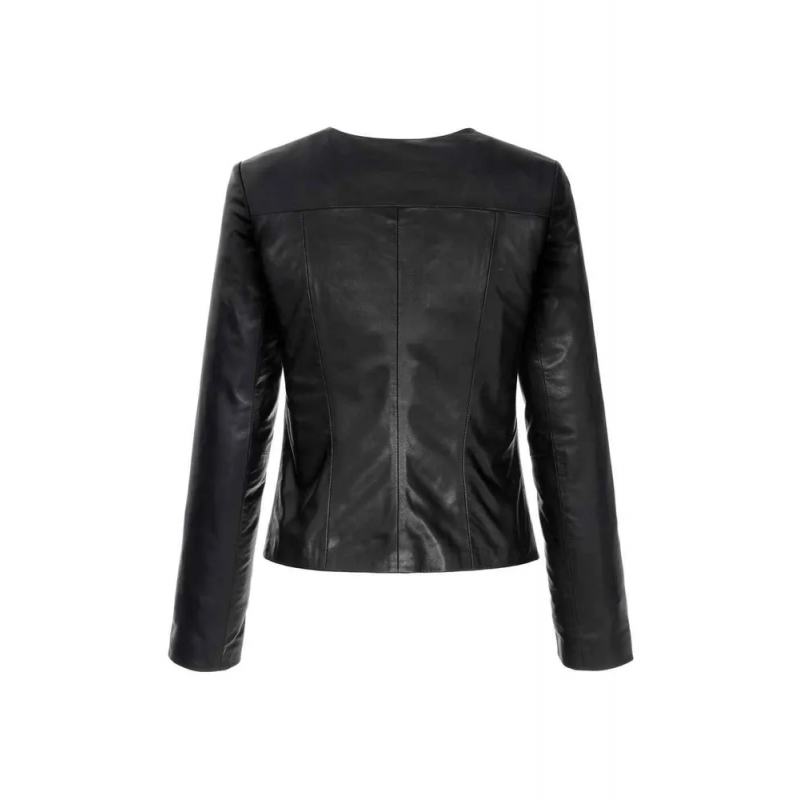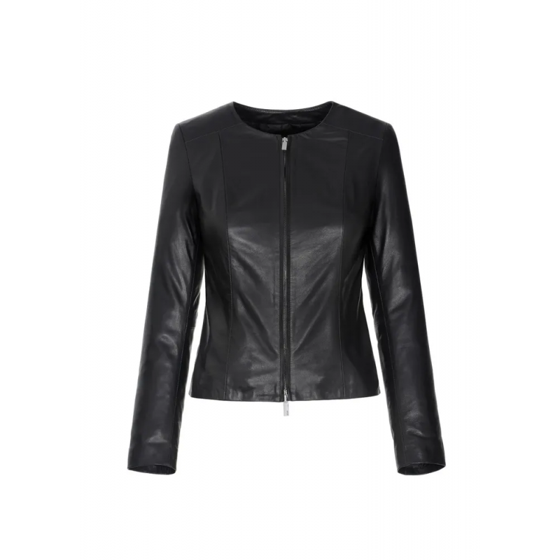 Krótka kurtka damska uszyta z lekkiej, miękkiej naturalnej skóry owczej w klasycznym czarnym kolorze. Prosta, uniwersalna forma gwarantuje ponadczasowość modelu, dzięki niej model stanowi doskonały element „bazowy” w szafie, dający się łatwo zestawiać z innymi fasonami. Sprawdza się w wielu połączeniach – zarówno ze stylem eleganckim, jak i sportowym. Krótka forma jest bardzo komfortowa dla osób o szerszych biodrach i wąskiej talii, wygodna podczas jazdy samochodem. Linia blisko ciała, model nieocieplany, dekolt okrągły, zapięcie na dwubiegunowy suwak, brak kieszeni, długość zakrywająca biodra, elementy metalowe w kolorze jasnego niklu