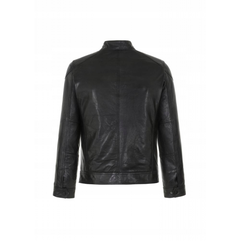 Kurtka męska w czarnym kolorze. Wykonana z naturalnej skóry owczej typu New Zeland. Model nieocieplany, sylwetka standardowa, zapięcie na suwak, dwie kieszenie zewnętrzne, trzy kieszenie wewnętrzne, regulacja mankietów za pomocą nap, długość okolice bioder.