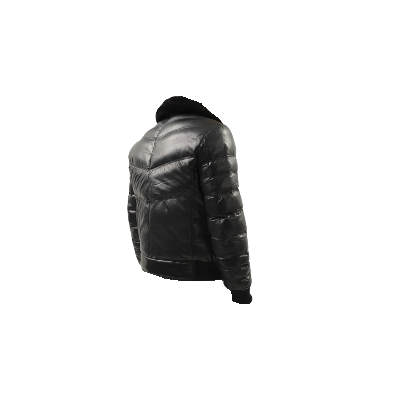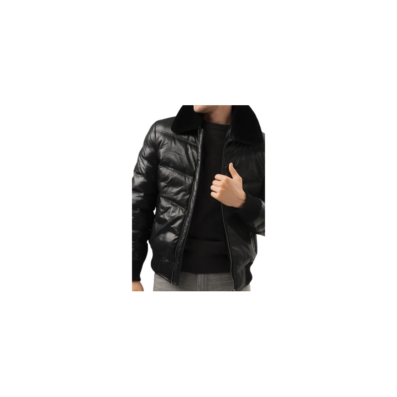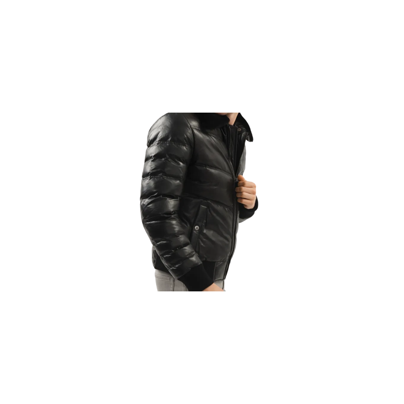 Męska ocieplana kurtka wykonana z naturalnej skóry owczej w kolorze czarnym. Posiada odpinany kołnierz ze skóry naturalnej z okrywą włosową. Model zdobiony pikowaniem posiada dwie kieszenie zewnętrzne zapinane na zatrzaski oraz dwie wewnętrzne – jedna zamykana na suwak, druga na rzep.