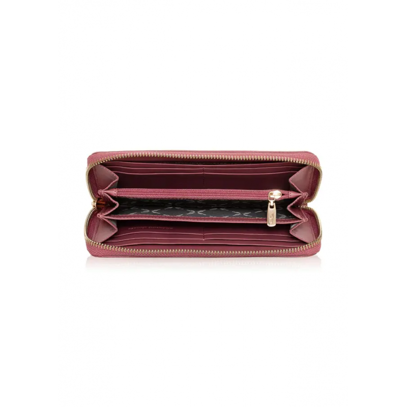 Portfel jest jednokomorowy. Posiada wygodne i bezpieczne zapięcie na suwak. W środku można znaleźć aż sześć przegród, w tym jedną z zapięciem na suwak, do której można schować bilon. Dodatkowo, wewnątrz znajduje się osiem małych, otwartych kieszonek na karty czy wizytówki. Na frontowej ścianie zaprojektowano minimalistyczny symbol marki w kolorze złota.
