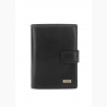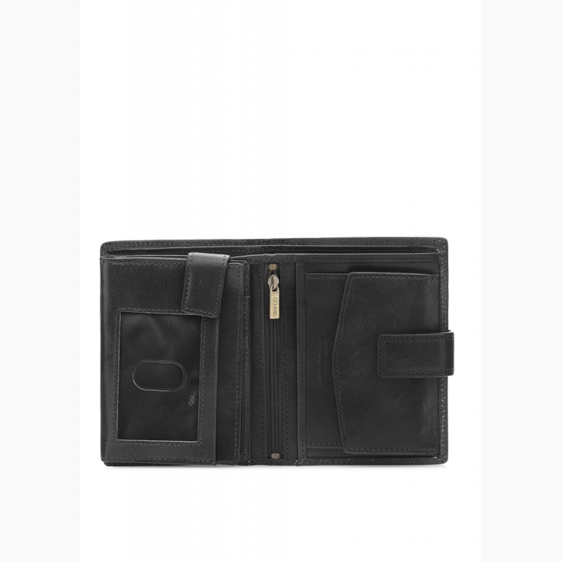 Portfel męski, wykonany z wysokiej jakości, naturalnej skóry bydlęcej w czarnym kolorze, posiada 2 kieszenie na banknoty, 1 duże miejsce na monety, 8 miejsc na karty kredytowe,7 dodatkowych kieszeni w tym 1 zamykana na suwak oraz 3 przeźroczyste, miejsce na dowód osobisty, całość zamykana na pasek z zatrzaskiem. Kieszenie mieszczą dowód rejestracyjny.