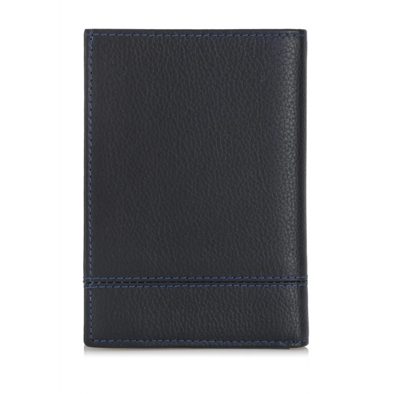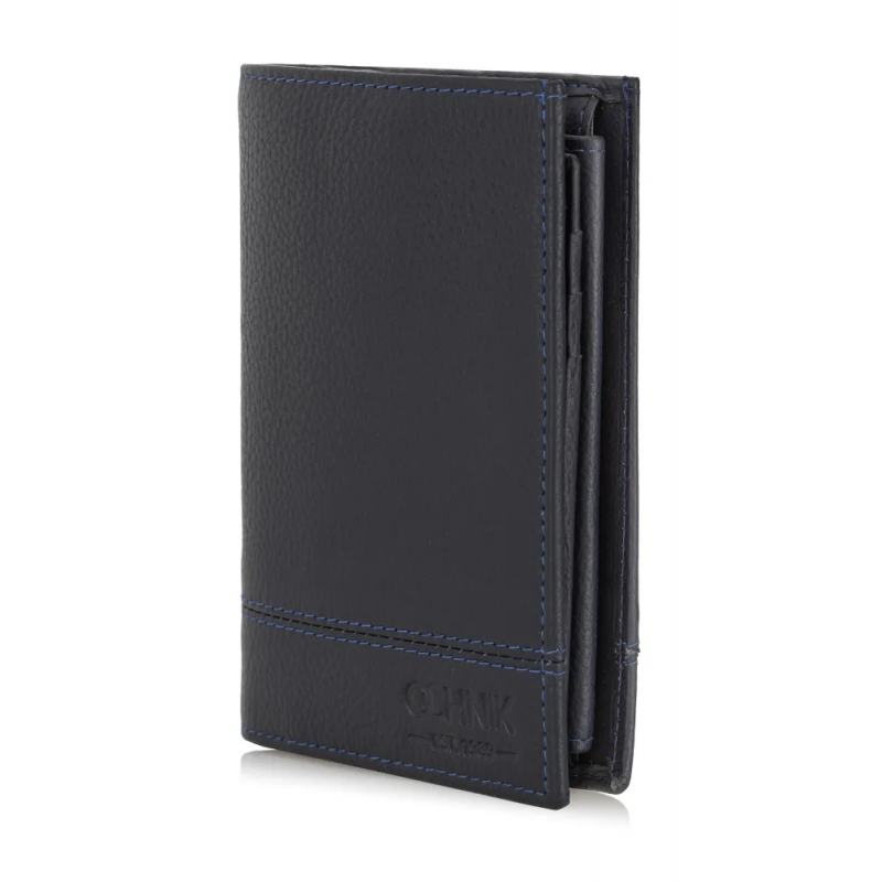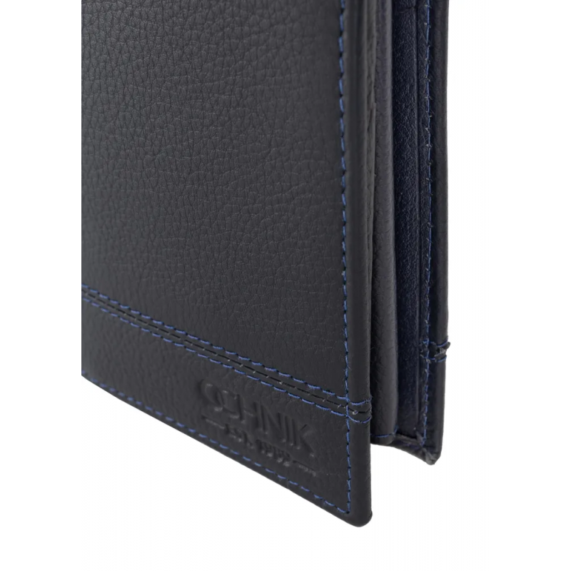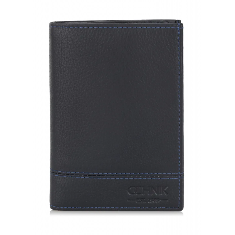 Portfel męski w kolorze granatowym. Wykonany ze skóry naturalnej o groszkowanej strukturze z tłoczonym logo marki OCHNIK.