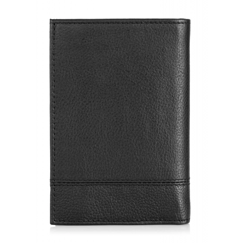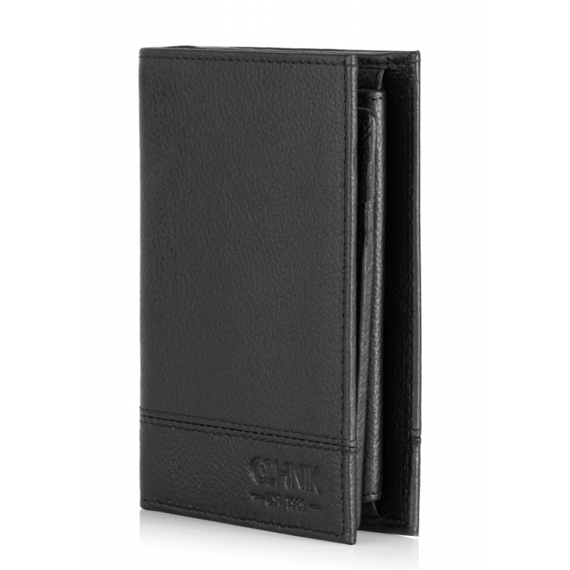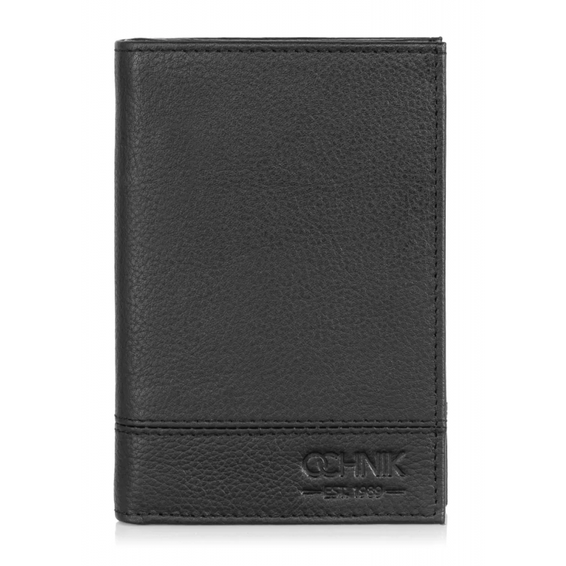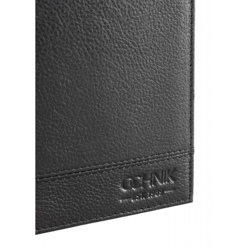 Portfel męski w kolorze czarnym. Wykonany ze skóry naturalnej o groszkowanej strukturze z tłoczonym logo marki OCHNIK.