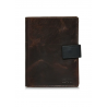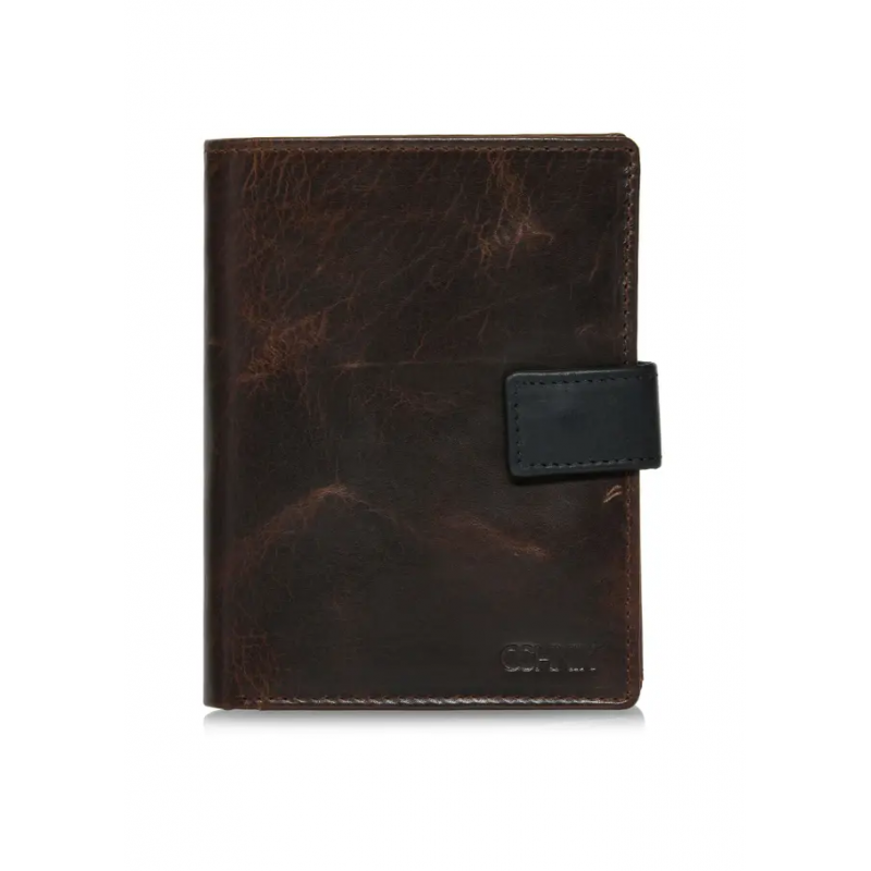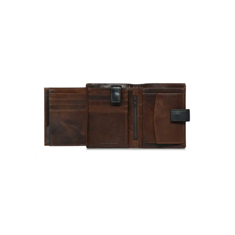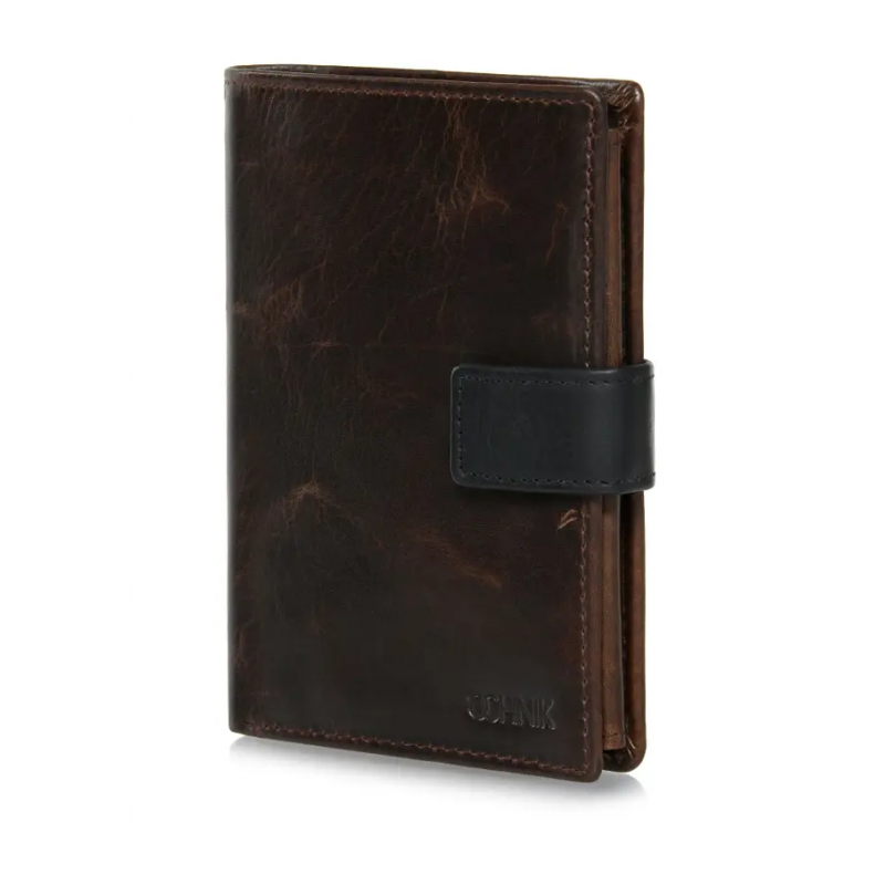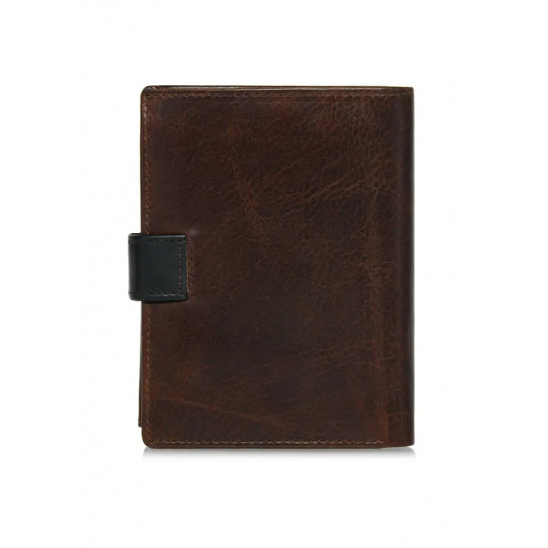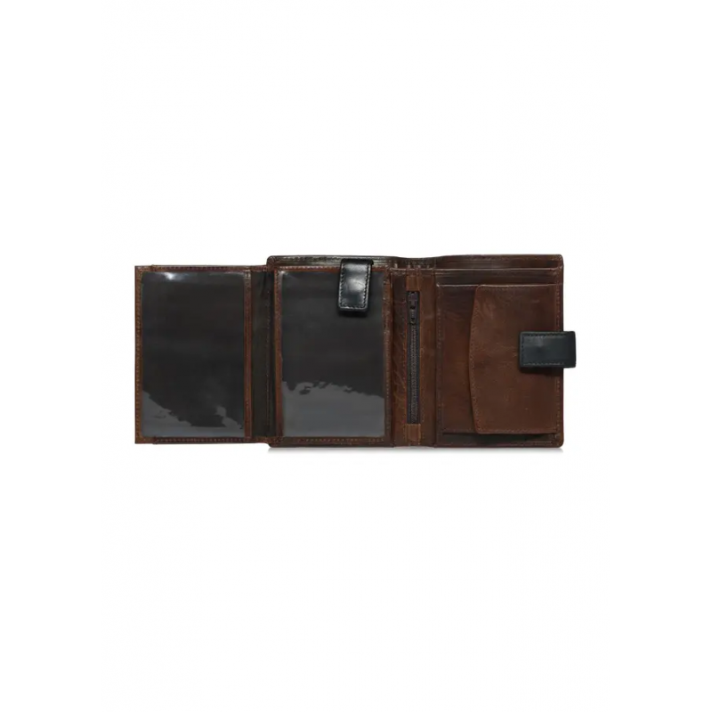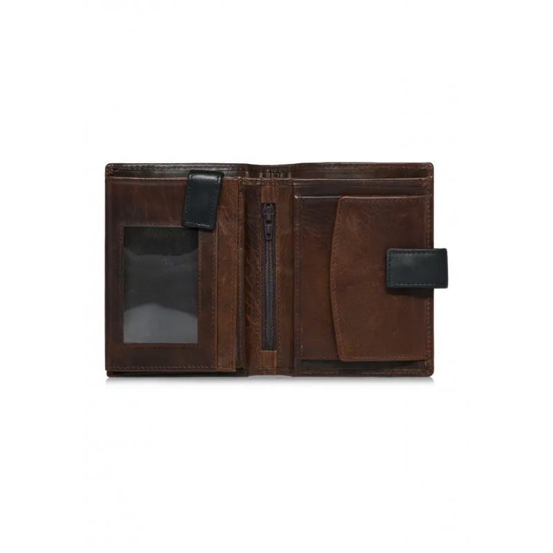 Brązowy skórzany portfel męski został wykonany z naturalnej skóry. Model składany w orientacji pionowej posiada zapięcie na zatrzask, co zapewnia bezpieczeństwo przechowywanych przedmiotów. Wyposażony w dwie kieszenie na banknoty oraz dwie kieszenie na bilon – jedną zapinaną na zatrzask, drugą na suwak. Wnętrze portfela oferuje aż 8 kieszeni na karty lub wizytówki, 3 transparentne kieszenie na dokumenty oraz 2 dodatkowe przegródki. Tłoczony logotyp marki podkreśla jego prestiż. Portfel mieści dowód rejestracyjny, co czyni go bardzo praktycznym.