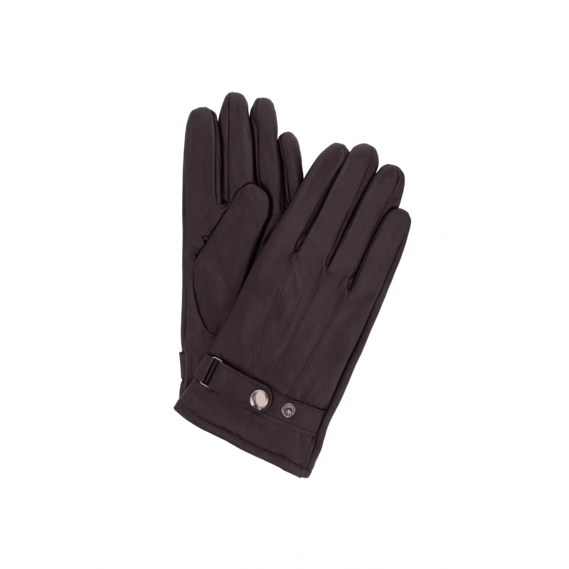 Zobacz większy Rękawiczki męskie, krótkie w kolorze ciemnym brązowym. Wykonane z naturalnej skóry. Podszewka z zapewniającej ciepło wełny. W okolicach nadgarstka, po zewnętrznej stronie ozdobny pasek na zatrzask (z możliwością regulacji).