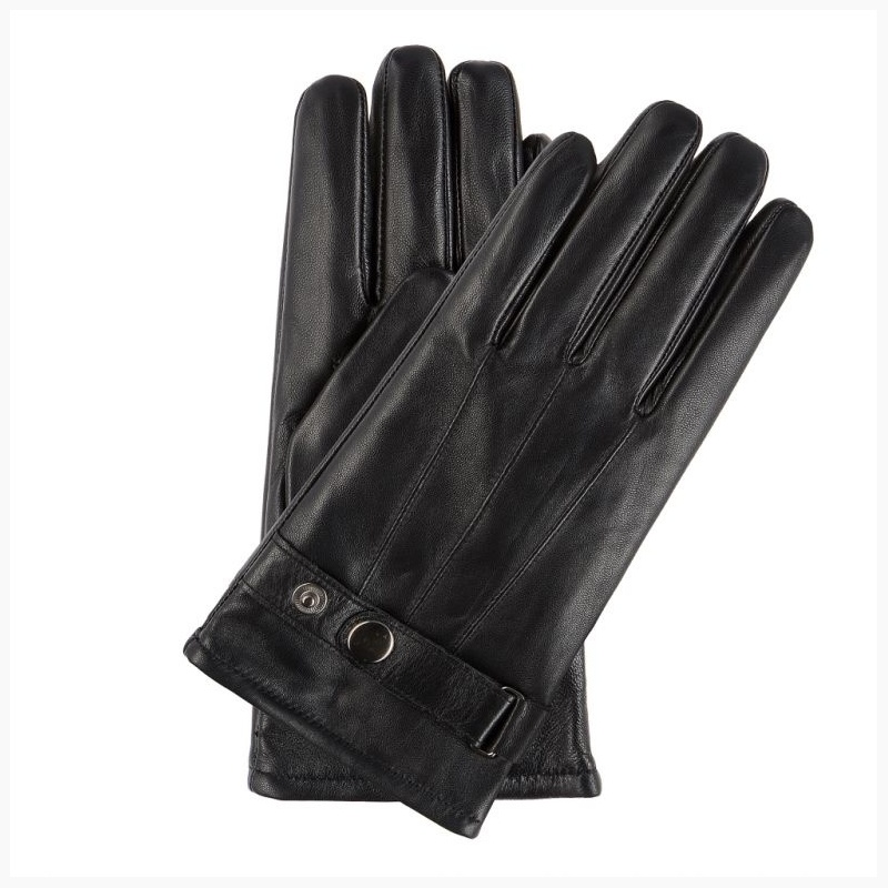 Zobacz większy Rękawiczki męskie krótkie w kolorze czarnym. Wykonane z naturalnej skóry owczej. Podszewka z zapewniającej ciepło wełny. W okolicach nadgarstka, po zewnętrznej stronie ozdobny pasek na zatrzask (z możliwością regulacji).