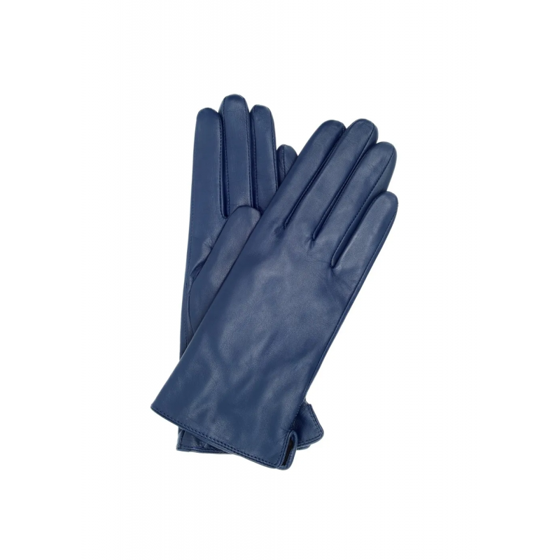 Eleganckie rękawiczki damskie w kolorze granatowym. Wykonane z naturalnej skóry owczej. Ocieplone tkaniną poliestrową. Klasyczny, prosty krój wykończony delikatnym przeszyciem. Na wewnętrznej stronie małe nacięcie ułatwiające nakładanie.