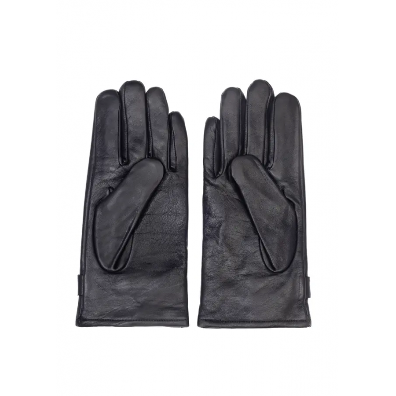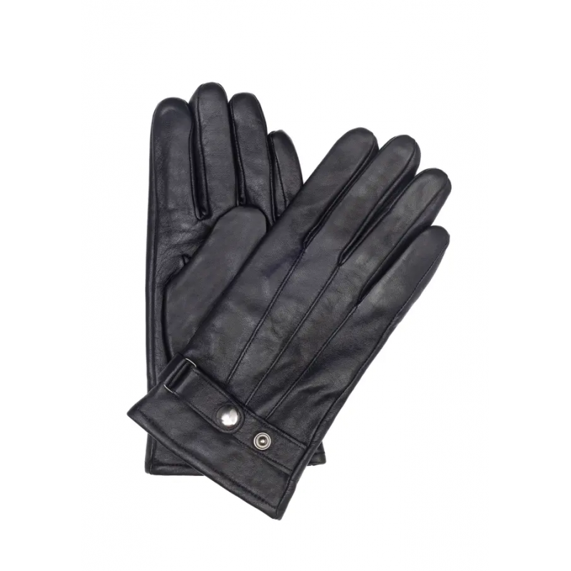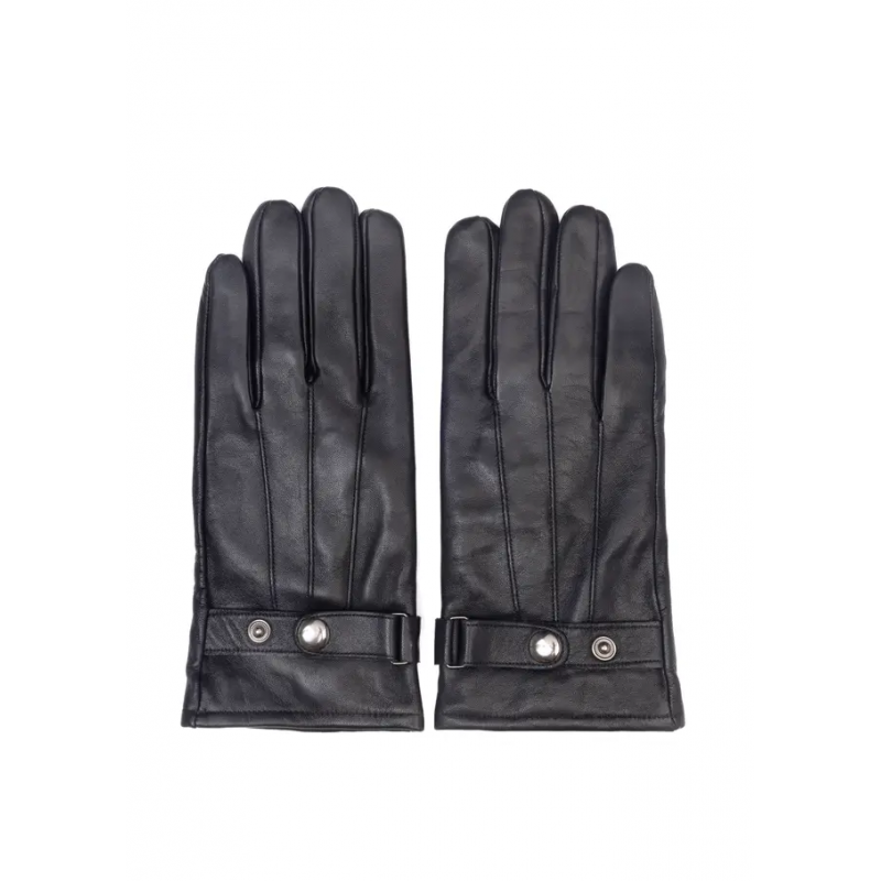 Rękawiczki męskie krótkie w kolorze czarnym. Wykonane z naturalnej skóry. Podszewka z zapewniającej ciepło wełny. W okolicach nadgarstka, po zewnętrznej stronie ozdobny pasek na zatrzask (z możliwością regulacji).