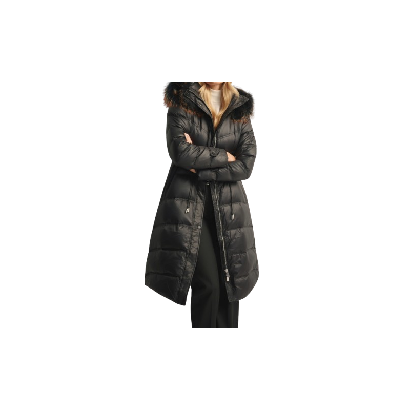 Model posiada odpinany kaptur wykończony naturalnym futrem z jenota, które dodaje luksusowego charakteru i można je łatwo zdjąć. Kurtka zapinana jest na suwak i napy, ozdobiona pikowaniem.