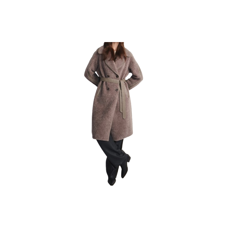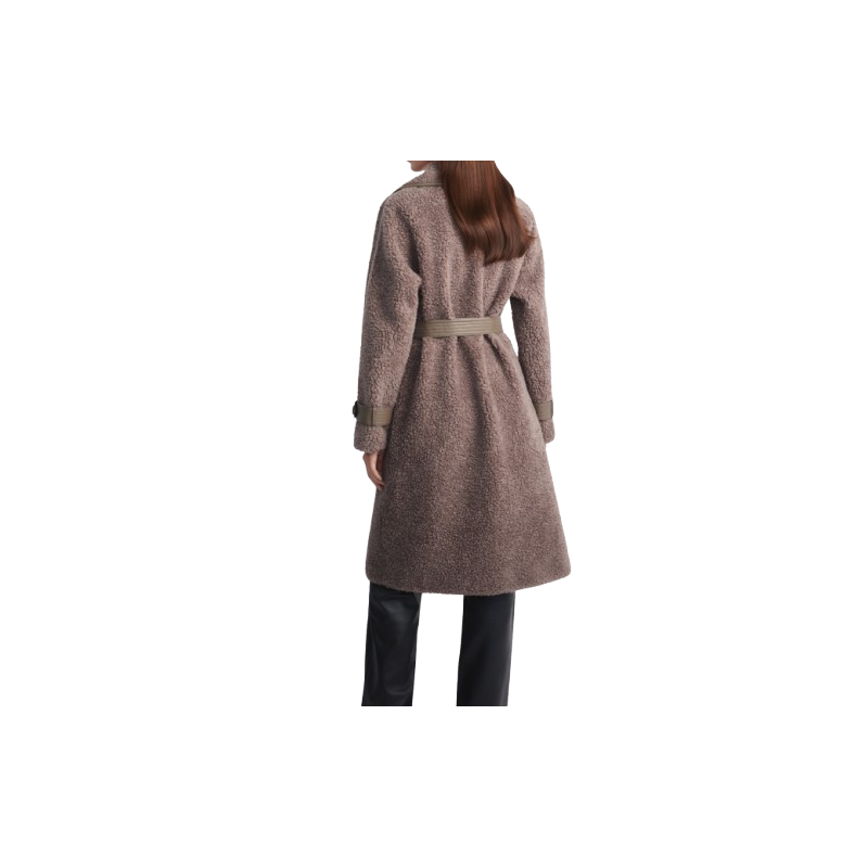 Futro zapinane jest na dwurzędowe guziki, co dodaje mu elegancji i struktury. Dwie praktyczne kieszenie zewnętrzne oraz ozdobne paski z guzikiem przy mankietach to subtelne detale, które przyciągają wzrok.