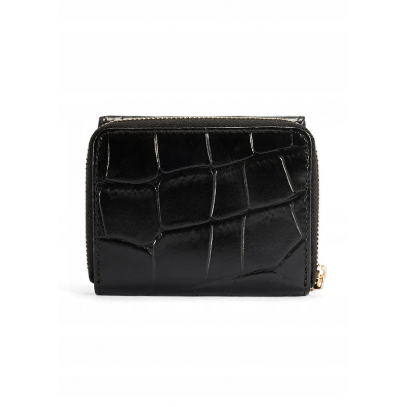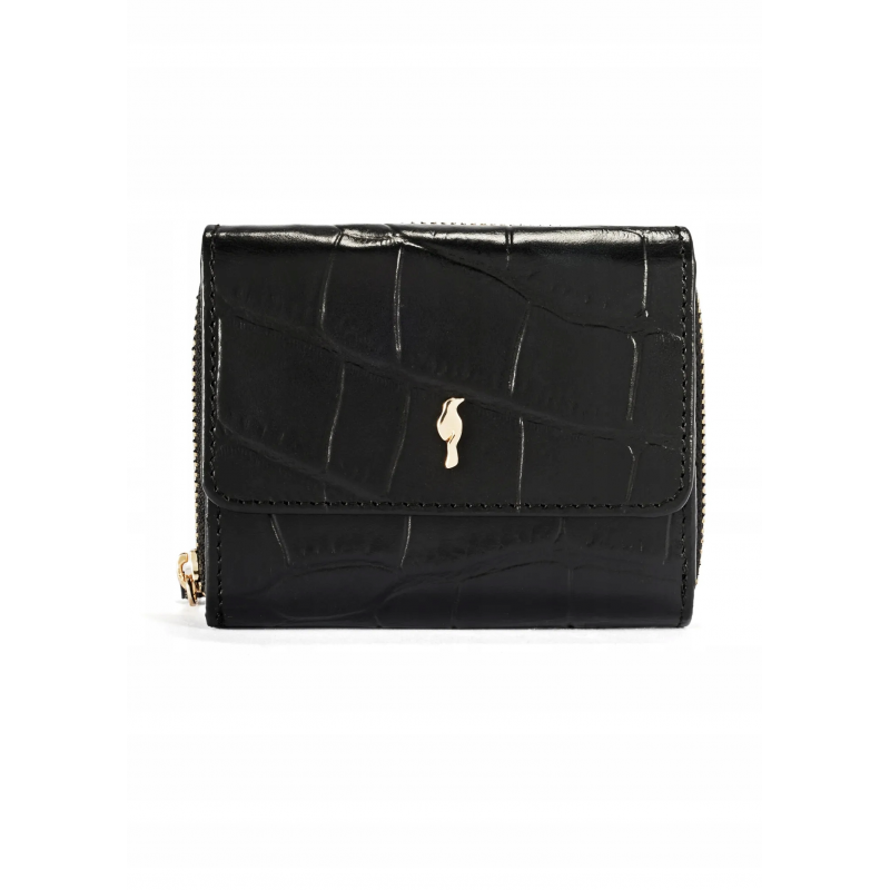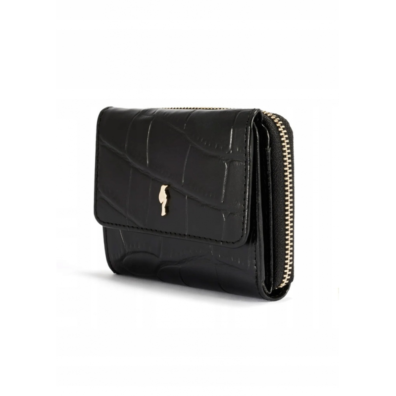 Zewnętrzna kieszeń na suwak zawiera dwie, funkcjonalne przegrody na bilon, a elegancki charakter produktu podkreślają metalowe elementy w kolorze złotym.