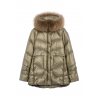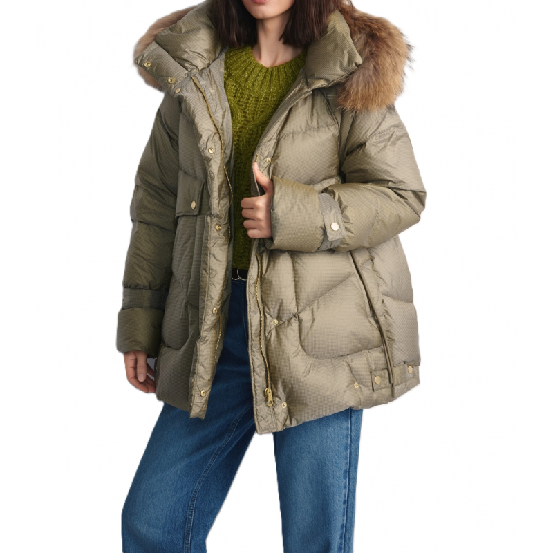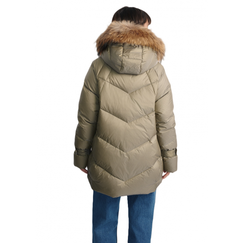 Subtelny, błyszczący wzór w kratkę nadaje całości szykownego charakteru, a odpinane futro z jenota przy kapturze dodaje luksusowego wykończenia.