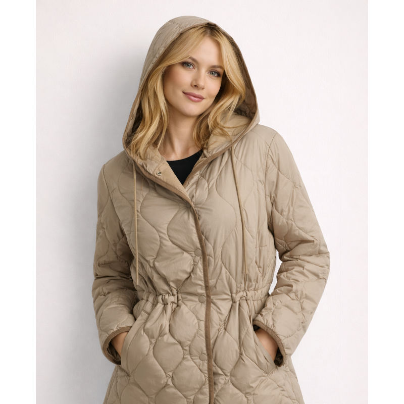 ciemnobeżowa pikowana kurtka damska w fasonie parki to doskonały wybór na chłodniejsze dni.
