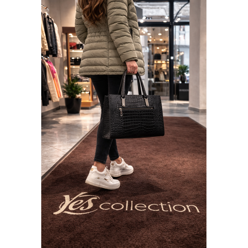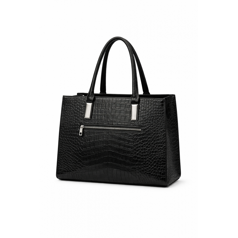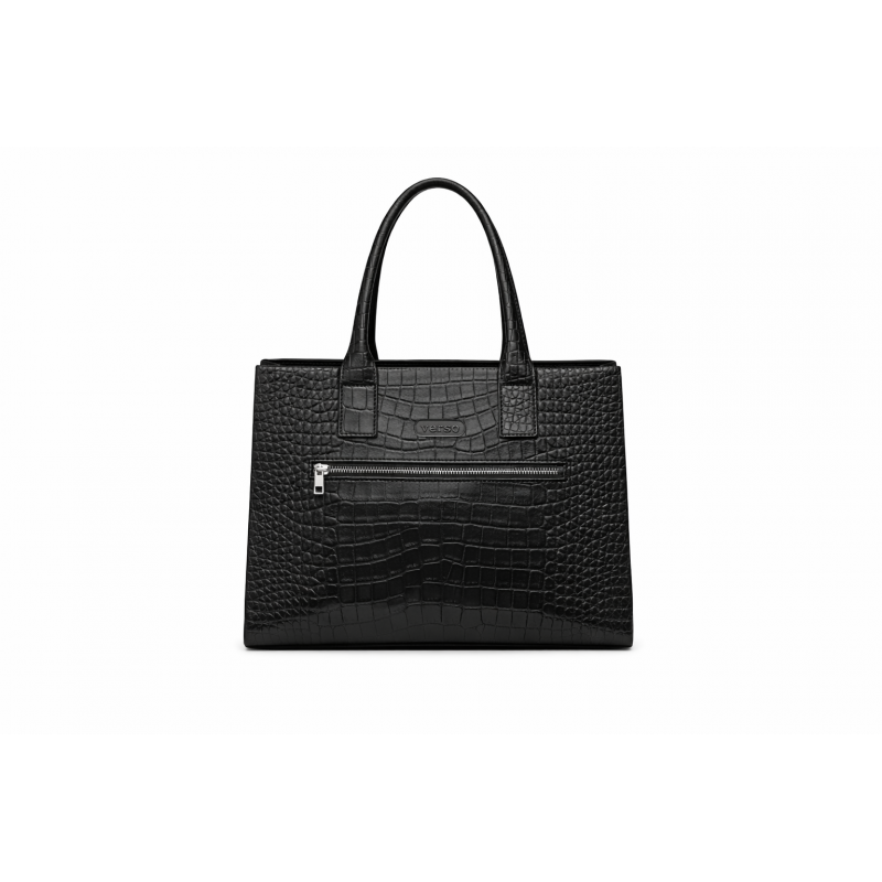 Stylowa i ponadczasowa torebka polskiej marki VERSO, wykonana z wysokiej jakości skóry naturalnej tłoczonej na wzór krokodyla (tzw. croco). Charakterystyczna faktura nadaje jej luksusowego wyglądu, a klasyczna czerń sprawia, że idealnie pasuje zarówno do codziennych, jak i eleganckich stylizacji.