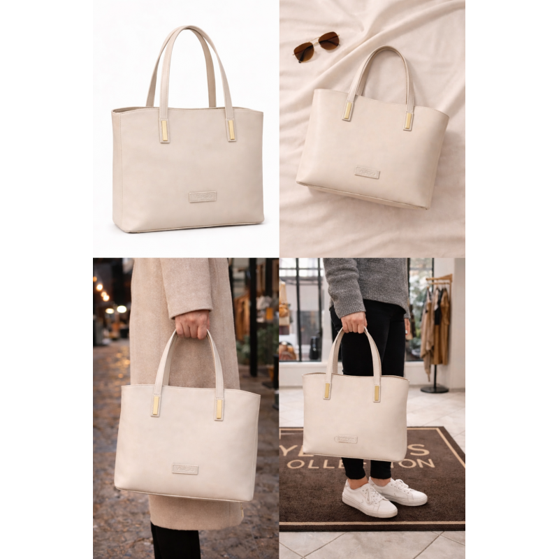 Torebka wyróżnia się minimalistycznym designem, starannym wykończeniem oraz funkcjonalnością – wygodne rączki pozwalają komfortowo nosić ją w dłoni lub na ramieniu.