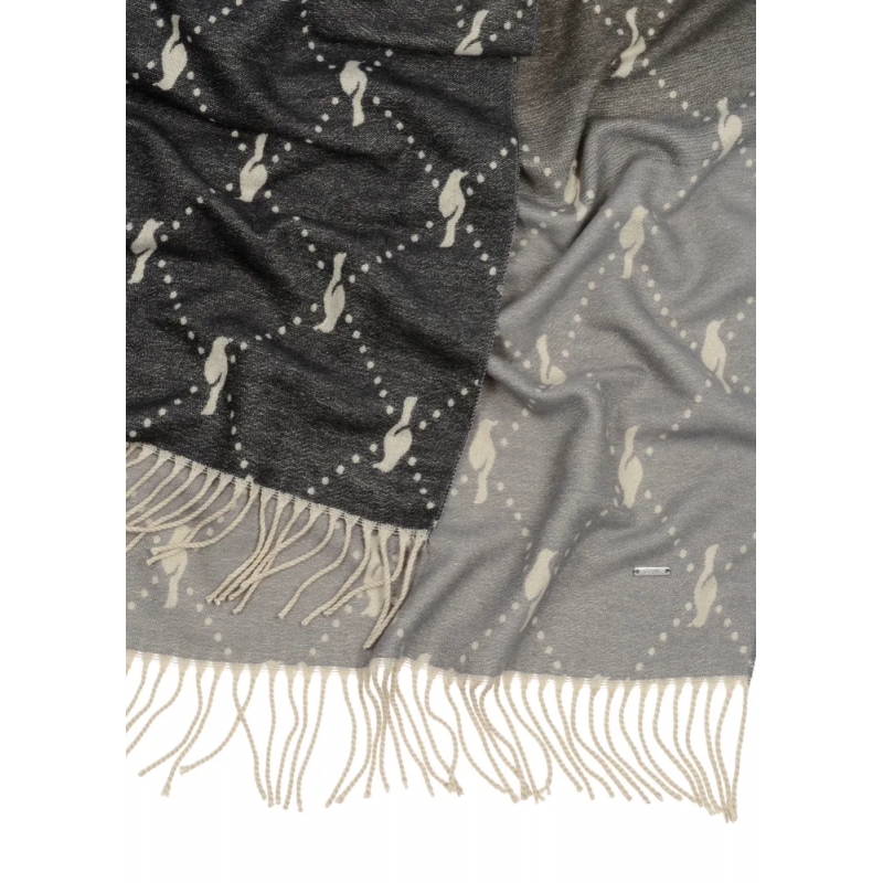 Duży, przyjemny w dotyku szalik utrzymany w kolorystyce szarości i beżu. Dzięki swojej długości zapewnia dobrą ochronę przed zimnem oraz sprawdza się jako elegancki dodatek do jesiennych i zimowych stylizacji. Zdobiony wzorem z graficznym symbolem marki OCHNIK – wilgą.