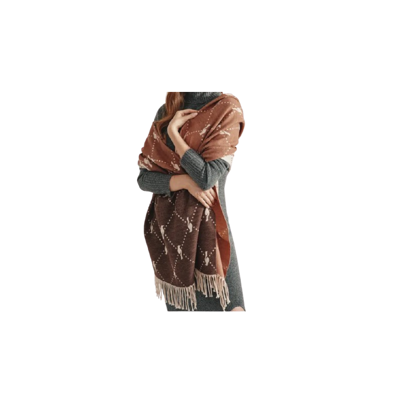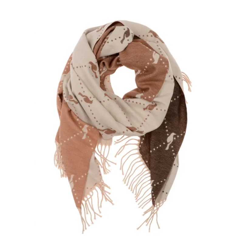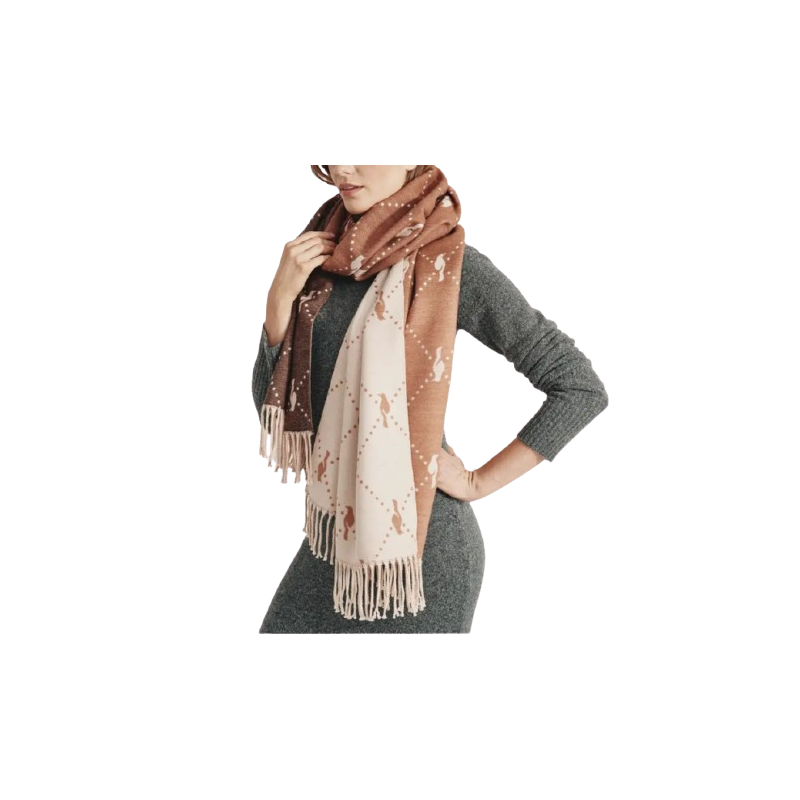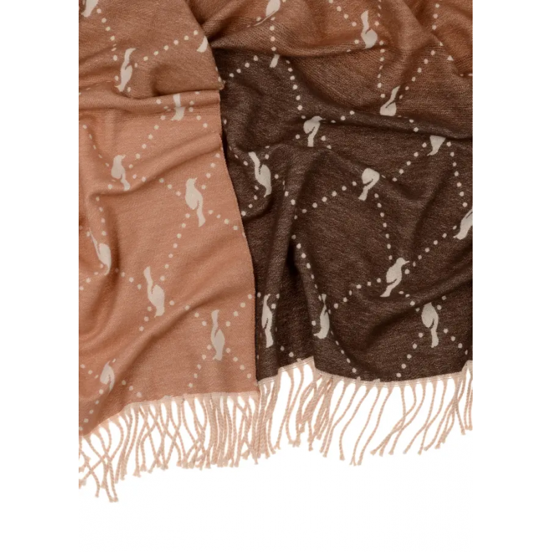 Duży, przyjemny w dotyku szalik utrzymany w kolorystyce brązów i beżu. Dzięki swojej długości zapewnia dobrą ochronę przed zimnem oraz sprawdza się jako elegancki dodatek do jesiennych i zimowych stylizacji. Zdobiony wzorem z graficznym symbolem marki OCHNIK - wilgą.
