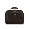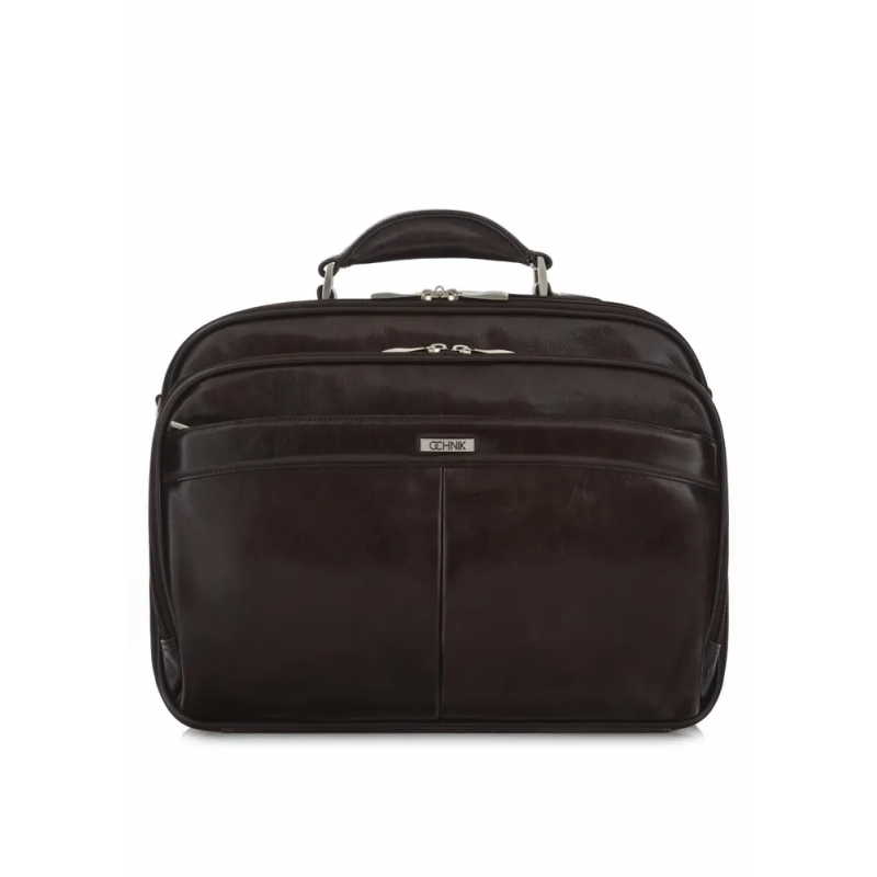 Ekskluzywna torba z bydlęcej skóry licowej w kolorze brązowym. Dwukomorowa, każda komora zamykana na 2 suwaki. W pierwszej komorze zabezpieczona przegroda na laptopa 15", 2 kieszenie siateczkowe otwarte oraz 1 duża kieszeń zamykana na suwak. W drugiej komorze 3 przegrody na dokumenty formatu A4. Z przodu torby 2 duże kieszenie. Wewnątrz większej 1 kieszeń zamykana na klapkę z rzepem, 4 miejsca na karty kredytowe, 2 miejsca na długopisy, otwarta kieszeń na telefon komórkowy oraz 3 siatkowe otwarte.