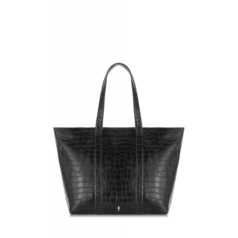 Torebka damska w czarnym kolorze. Wykonana ze skóry naturalnej z tłoczeniem imitującym skórę krokodyla. Posiada rączki umożliwiające noszenie na ramieniu lub w dłoni. Zwierzęcy motyw, zapięcie na suwak, wewnątrz kieszeń na suwak oraz kieszeń otwarta, elementy metalowe w kolorze jasnego złota, model mieści format A4