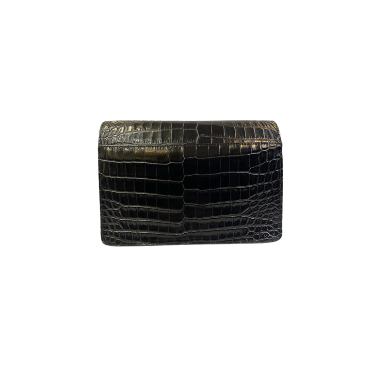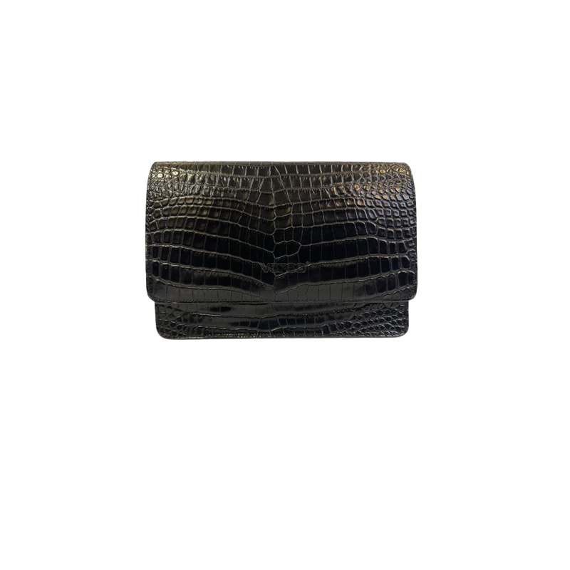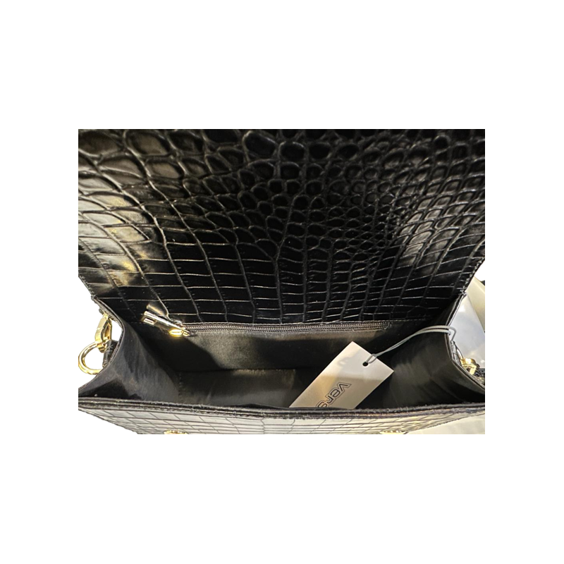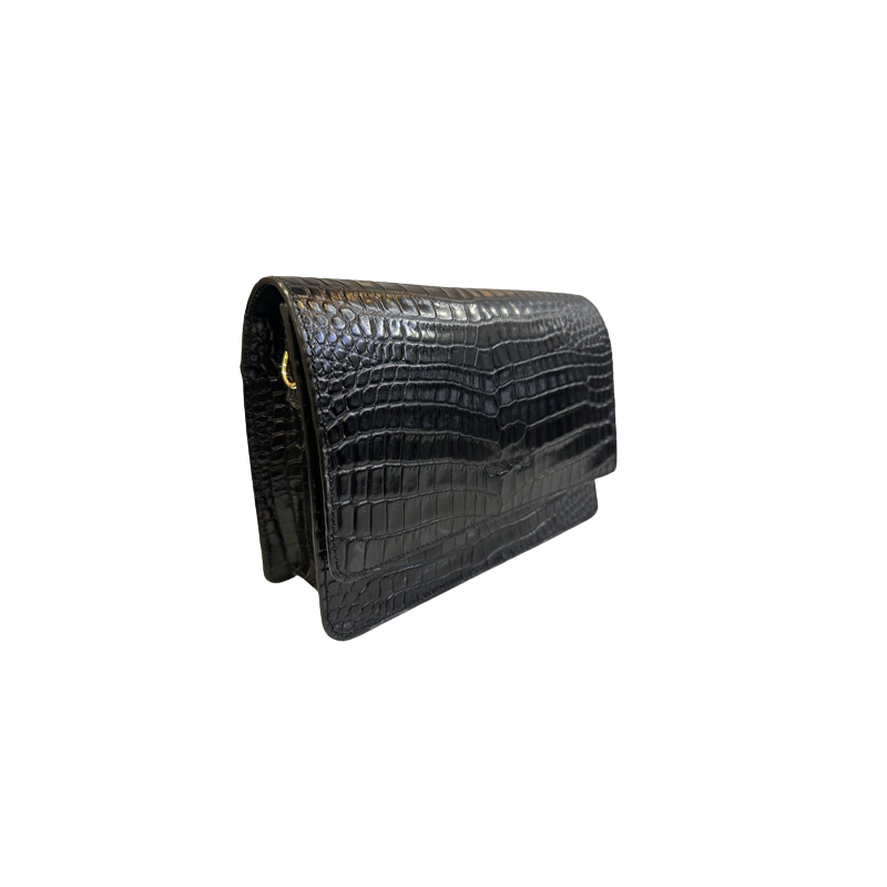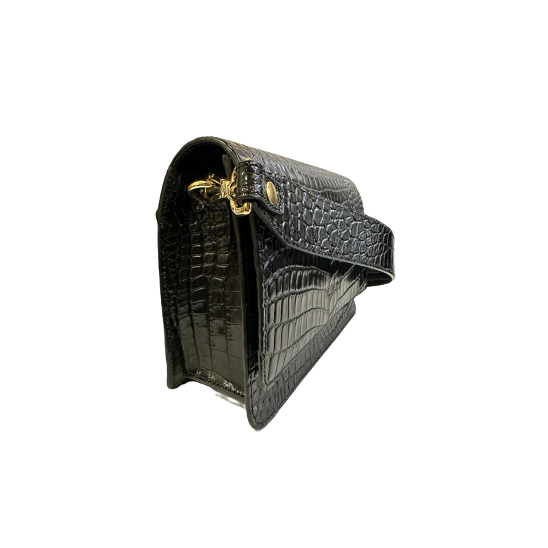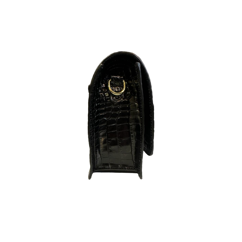 Damska torebka typu listonoszka w czarnym kolorze. Wykonana ze skóry naturalnej z ozdobnym tłoczeniem imitującym skórę krokodyla. Model posiada wygodny pasek umożliwiający noszenie na ramieniu lub na ukos.