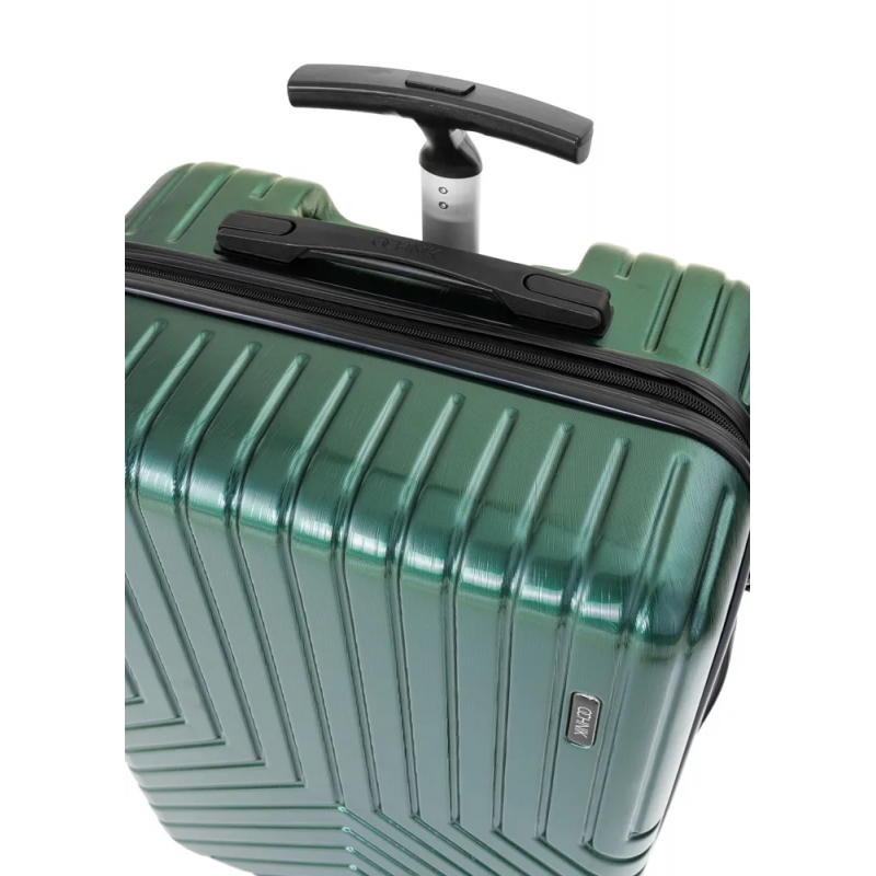 Mała walizka wykonana z bardzo wytrzymałego materiału PC w kolorze zielonym. Kółka podwójne, wykonane z mieszanki kauczuku i gumy, łożyskowane, obrót 360 stopni. Wewnątrz komora podzielona na dwie części, w jednej przestrzeń zamykana materiałem na suwak, w drugiej – elastycznymi pasami zabezpieczającymi. Dla jak najbezpieczniejszej podróży, walizka jest zaopatrzona w zintegrowany zamek TSA. Jest to najlżejsza walizka z kolekcji. Łączy w sobie najniższą wagę oraz odporność na uderzenia. Świetnie sprawdzi się jako bagaż podręczny do linii lotniczych: Ryanair, American Airlines, LOT, Norwegian, Wizzair, Easy Jet, Lufthansa.