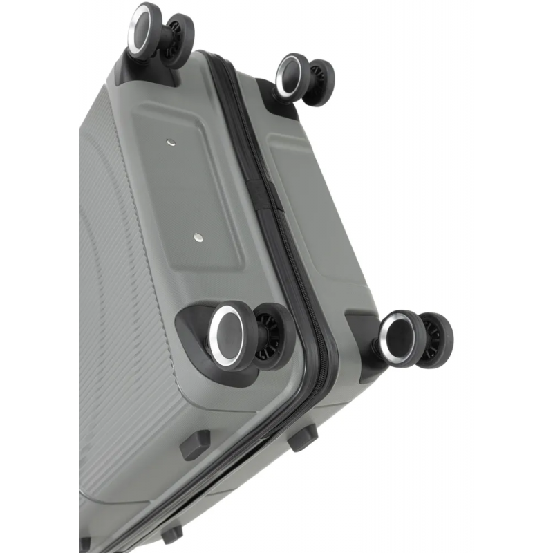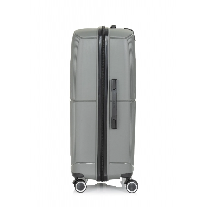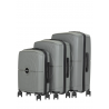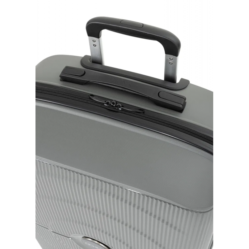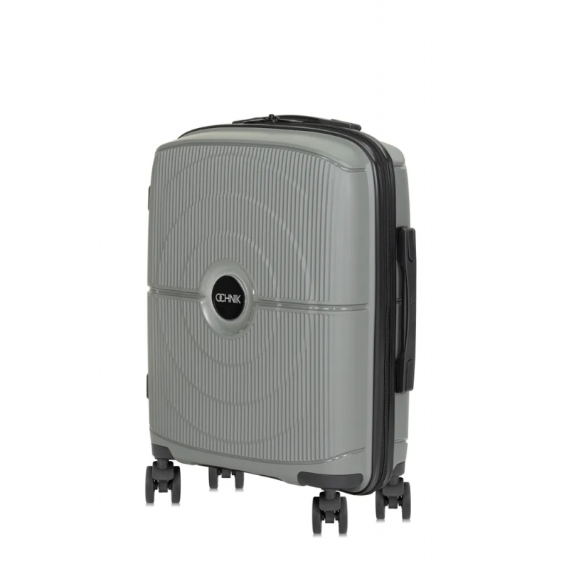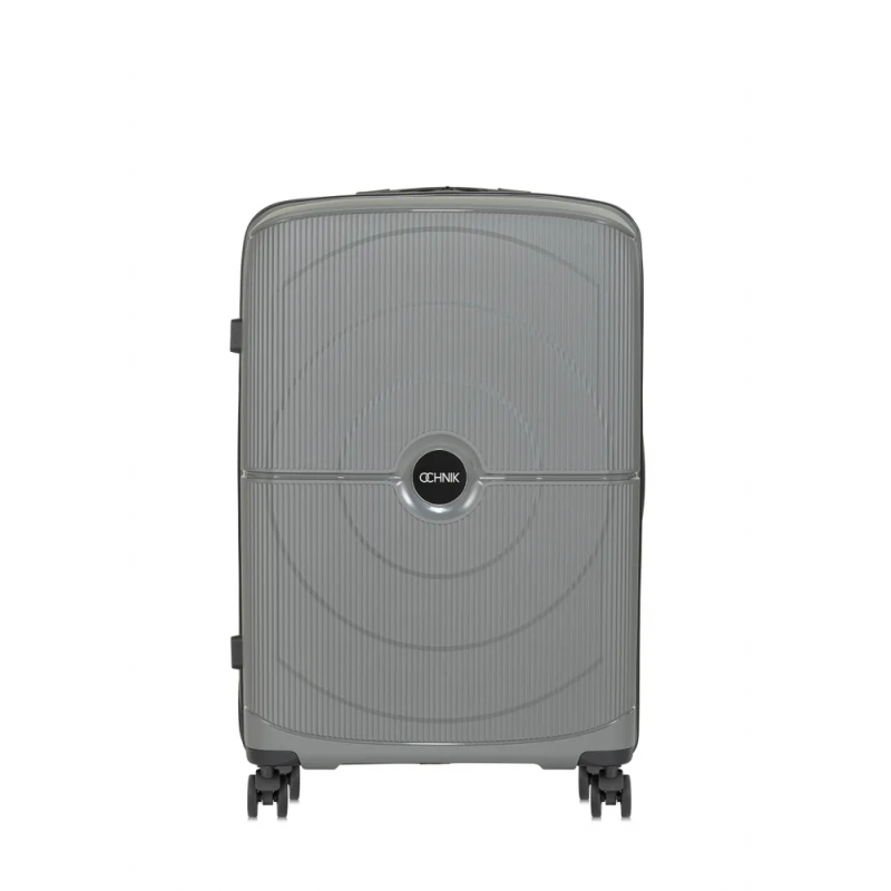 Komplet walizek wykonany z bardzo lekkiego, sztywnego i odpornego na zarysowania materiału PP (polipropylen) w szarym kolorze. Model z ozdobnymi tłoczeniami oraz okrągłym logo marki OCHNIK z przodu walizki. Walizka posiada podwójne kółka, wykonane z mieszanki kauczuku i gumy, łożyskowane, obrót 360 stopni. Wewnątrz walizek jest komora podzielona na dwie części, w jednej przestrzeń zamykana materiałem na suwak, w drugiej – elastycznymi pasami zabezpieczającymi. Na komplet walizek składają się walizki w rozmiarach: 19’/24’/28’.